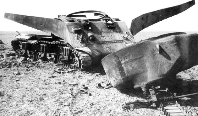 This August 1942 production Pressed Steel Car M4 with registration number 3015037 and named “BIGGIN” is probably the most spectacular wreck photographed. It was almost certainly destroyed by demolition charges set by the crew to prevent it from being captured and used by the Germans. With the hull sides blown out like that, the Sherman appeared to had wings.
