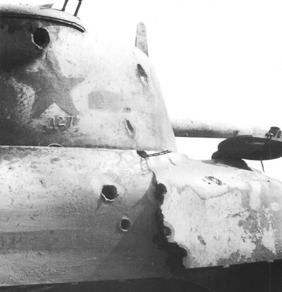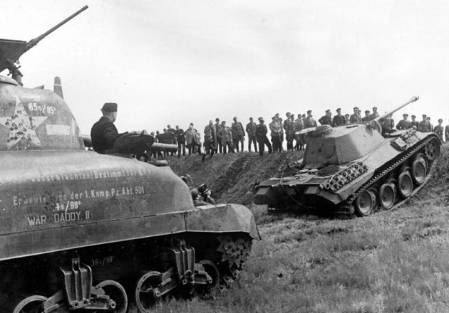 A demonstration at Hillersleben featured “War Daddy II” driving up a slope which it was unable to climb while a very early Panther Ausf. D was able to make it. Some of the photos showing the Sherman and Panther climbing the hill were used in propaganda campaigns, praising the superiority of German tank designs. Note the bullet impacts on the turret star of “War Daddy II” which were not present earlier during Speer’s inspection of the tank.