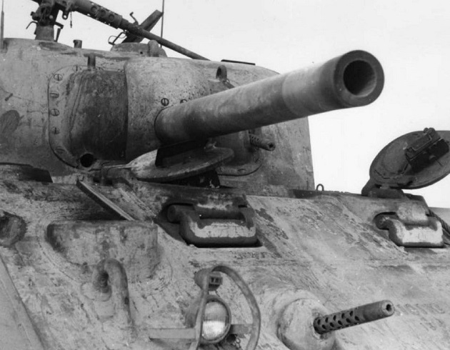 This Lima built M4A1 had a welded lower hull and also fitted with tail light bush guards and the rounded, fabricated grouser box vent covers. It has received many hits from German anti-tank guns and quite a few failed to penetrate the turret and the hull.