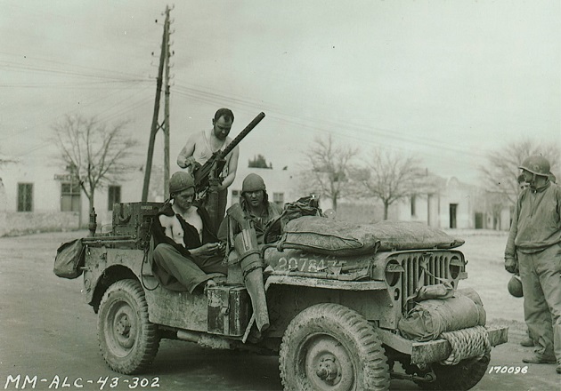 This jeep reconnaissance patrol returned to the US lines on February 17 after being trapped behind German positions for three days in the Djebel Lessouda area.