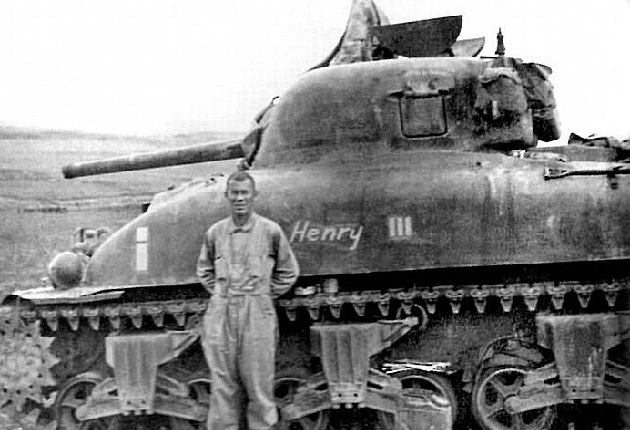 Lieutenant Colonel Gardiner standing next to his M4A1 named “Henry III” (“Henry” was a M3 Lee which was destroyed on 2 December 1942, “Henry II” was destroyed on 17 February 1943, and “Henry III” was destroyed on 6 May 1943.) Note the marking of the HQ company, 2/13th Armored Regiment on the front hull and the later bogies.