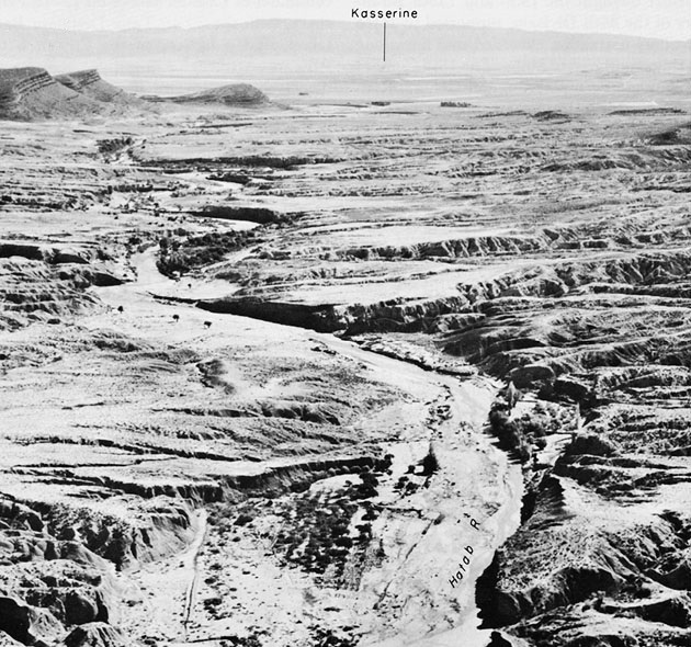 This is the view of the rugged terrain in Kasserine Pass looking southeast towards the narrowest part of the pass where the roads to Thala (to the left) and the road to Tebessa (to the right) diverge. In the foreground, the dried Hatab riverbed which snakes through the pass can be seen. At the time of the battle, the Hatab riverbed was engorged with water.