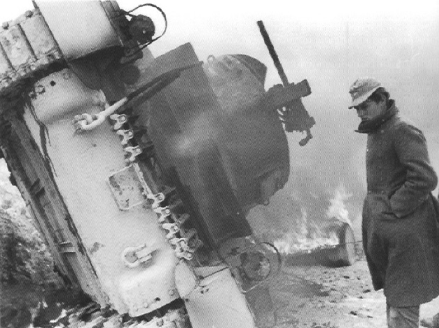The fact that this M4A1 is still burning together with the jubilant expression displayed by the German tanker on the far left would indicate that this photograph was taken shortly after the engagement had ended.