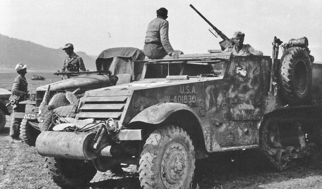 This captured US M3 half-track has the name “COMMANDO YANK” just forward the driver’s door with a hooded cartoon character below it with a star on his chest. Commando Yank was a popular cartoon hero in the 1940’s (Wow Comics #6-35.) On the bottom of the door is the name “GRENADIER”. The yellow star on the hull side has been covered with local mud. Note the Browning M1917A1 water cooled .30 Cal MG mounted on the half-track and the half-track behind it also has one mounted.