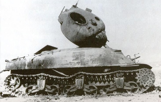 The force of the explosion blew the turret straight up into the air and it came straight down thrusting the gun barrel through the driver’s hatch resulting in the turret being precariously perched in mid-air. Note the direct vision ports and the M3 style bogies however this M4A1 had the later one-piece cast transmission housing.