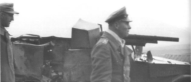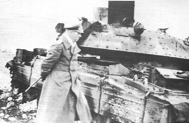 Rommel strolls pass a knocked out Crusader Mk. II CS (Close Support) on the Thala road. The Mk. II CS mounted a 3-inch (76.2 mm) howitzer in the turret.