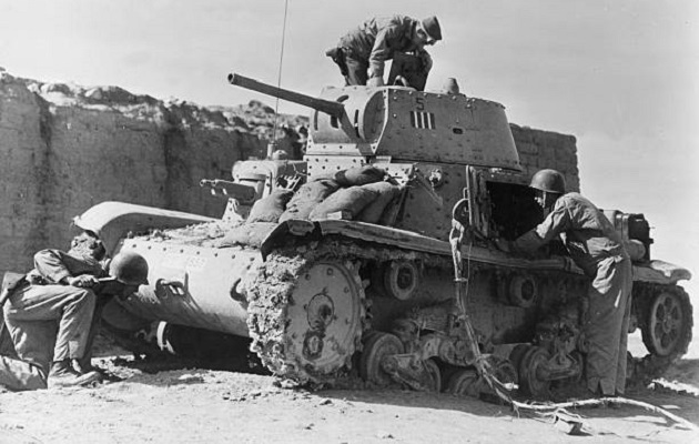 US troops examining an abandoned Fiat-Ansaldo Carro Armato M14/41 medium tank armed with a 47mm cannone da 47/32 AT gun (87 rounds). Crew: 4 (commander/gunner, radio operator/machine gunner, loader, and driver)