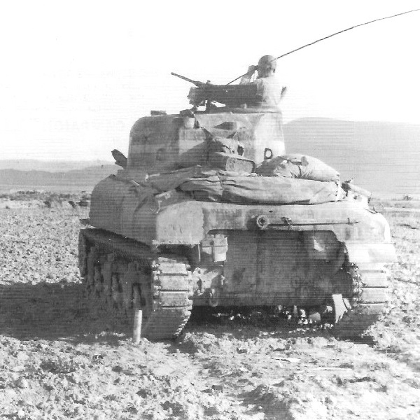 This surviving M4A1 tank from Company G, 3/1st Armored Regiment is towing a disabled M2 half-track car after an ill-fated attempt to prevent the encirclement of the 3/168th Infantry Regiment on Djebel Lessouda which is in the background. All sources incorrectly state the half-track in this photo is a M3 but the mine rack on the side only runs half the length of the hull at the rear. Between the driver’s door and the mine rack is the exterior hatch for the storage compartment directly behind the driver’s seat.