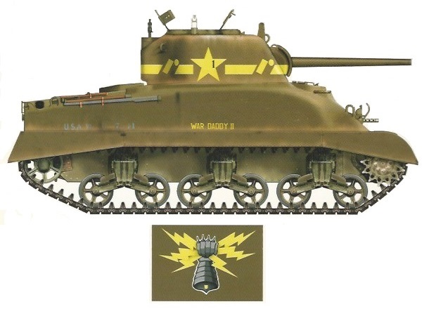 This M4A1 of the HQ Company, 2nd Battalion, 13th Armored Regiment was commanded by Major James Simmerman, the battalion’s executive officer. The camouflage scheme may have been applied using local mud which dried to a lighter color and the contrast does not show well in this B/W photograph. The second antenna mounted on the front hull indicating a command tank. Note the company marking on the front side hull and the name “Major Jim .”