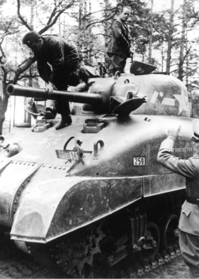 Albert Speer inspects and riding in captured M4A1 “War Daddy II” at Hillersleben.