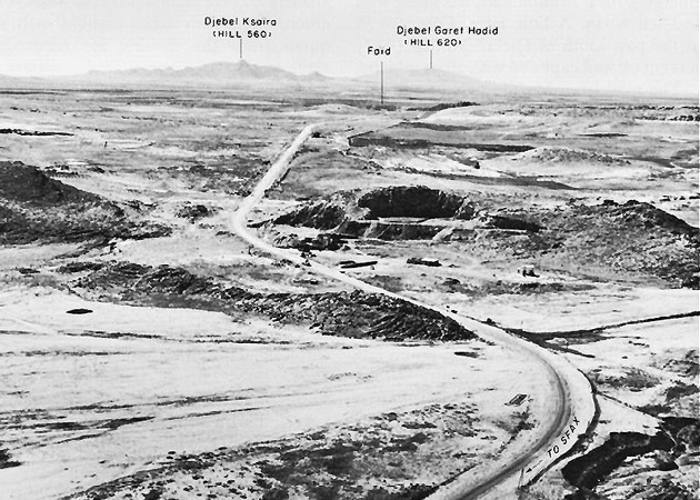This is the German view looking southwest from Faïd Pass. In the background, the village of Faïd, Djebel Ksaira and Djebel Garet Hadid can be seen. Djebel in Arabic-speaking countries refers to a mountain: often used as part of a place name to indicate that the place is situated on or near a mountain.
