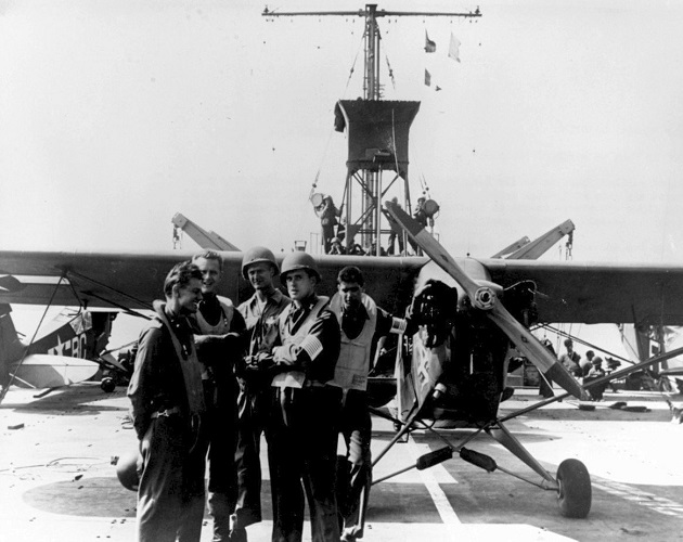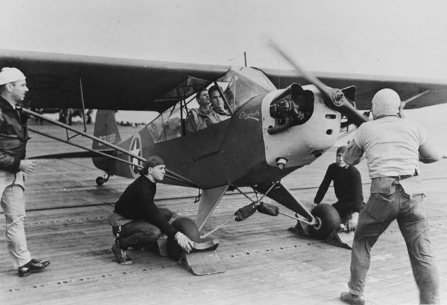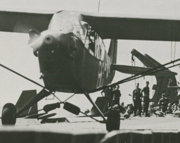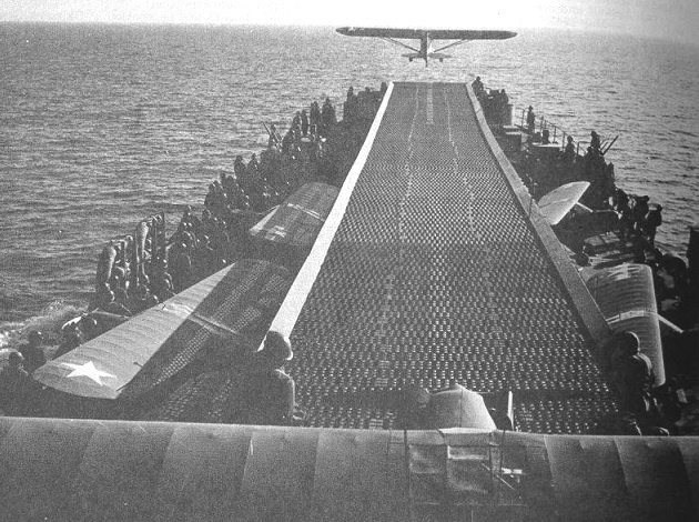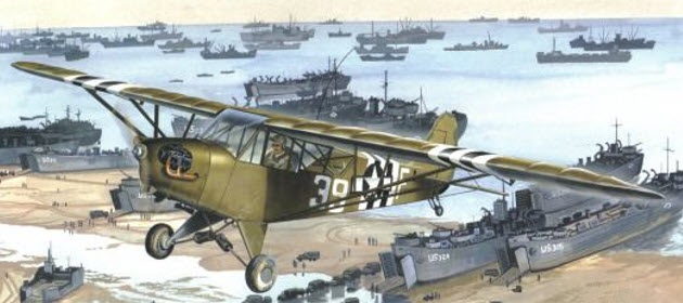 On 9 November 1942, three Army liaison L-4s, under the command of Army Captain Ford E. Allcom, took off from the deck of the aircraft carrier USS RANGER (CV-4) cruising off the coast of North Africa on the second day of Operation Torch. This was the first combat mission ever undertaken by US Army liaison aircraft. The little planes had no problem lifting off the carrier and then proceeded to a landing strip along the coast, all the while maintaining radio silence.