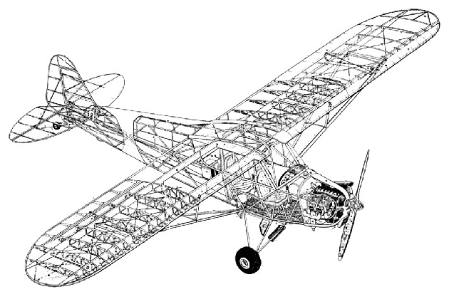 The US liaison aircraft of WWII was a high-wing, strut-braced monoplane with a large-area rectangular wing. It is most often powered by an air-cooled, flat-4 piston engine driving a fixed-pitch propeller. Its fuselage was a welded steel frame covered in fabric, seating a crew of two in tandem. It had no electrical system (the fuel gauge is a cork on a piece of wire), was easy to maintain and cheap to operate.