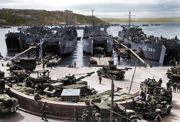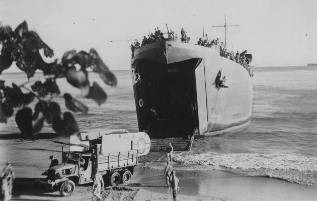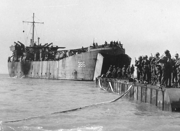 LST-386 unloading US troops onto a landing barge at Licata on the southwest coast of Sicily, date unknown. Note the improvised runway for launching US Army L-4/L-5 observation planes above the main deck. The wings of two planes ready for takeoff are visible.