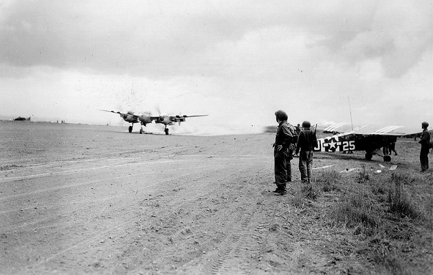 Sections of the German famous autobahn became ready-made runways for the US artillery observation planes of the fast moving divisions. The Piper L-4 on the left has the unit code “67” on the fuselage which is the US 9th Armored Division.