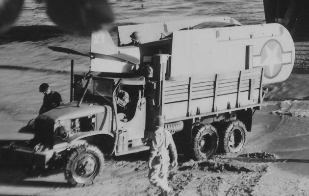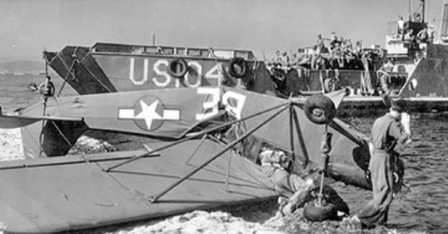 While flying over the Allied invasion fleet, the L-4 cubs were mistaken for enemy aircraft and were shot at. At the time, Vichy French bombers and fighters were attacking the ships of the invasion fleet. While taking evasive action, Allcom’s flight continued to head for the coast, where he was fired on again, this time by anti-aircraft guns of the US ground forces, believing the L-4s were enemy aircraft. With part of his cockpit shot away by the friendly fire, Allcom managed to land safely only to be wounded by machine-gun fire from Vichy French forces. Captain Allcom was fortunate enough to be aided by friendly local civilians, who rushed him to a US Army aid station. The other two planes in his flight were not as lucky.