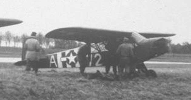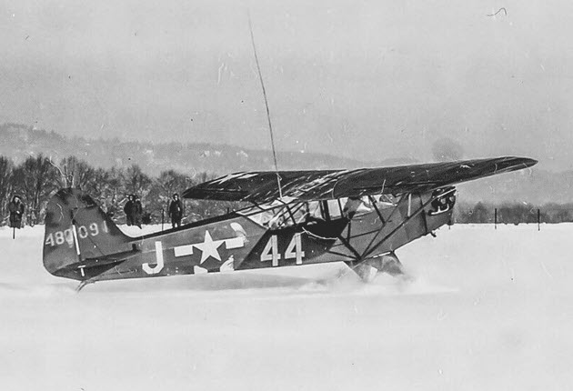 Piper L-4J, serial number 44-80091 and coded 44 ☆ J, was piloted by Major Jack Blohm of the US 30th infantry Division at Spa (northwest of Malmedy), Belgium, January 1945. Note the extended telescopic antenna AN-29-C on top of the fuselage.