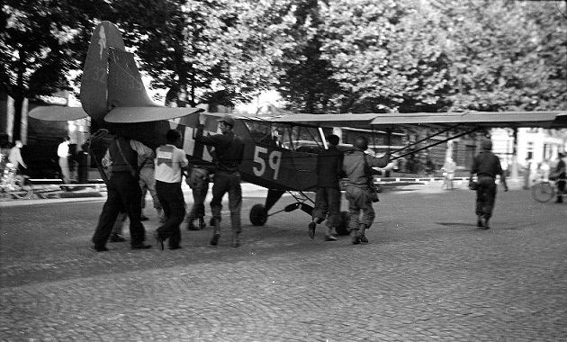 In May 1945, several US Piper L-4s landed on the road leading to Katowice near Strakonice, Czechoslovakia. They were looking for an airport in Lipky. Local scouts gave them directions. This Piper L-4H, s/n 43-29488, was coded 25 ☆ E. Note that there are no invasion stripes on any under surfaces of the plane.