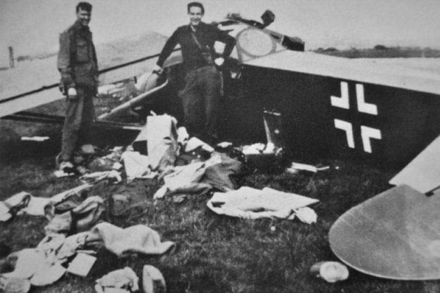 Francies and Martin posing beside the wreckage of their crashed adversary.