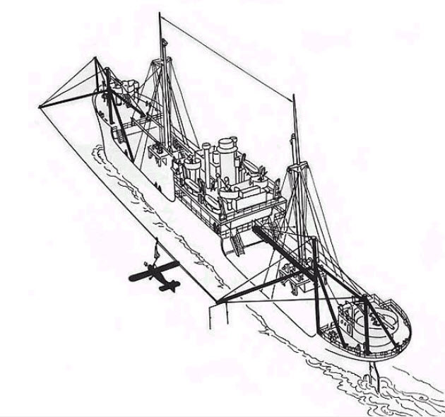 A hoist and sling device lifted the plane and its crew onto the trolley, then a special winch pulled the aircraft back to the ship’s stern-side end. The pilot gunned the engine, and a clutch released the trolley. The plane rolled along the cable, picking up speed. As the aircraft accelerated, the pilot pulled on a lanyard. This detached the plane from the sling, causing it to soar into the air. To land the aircraft, the pilot simply lined the aircraft up with the cable, and snagged the sling with a hook. The machine’s winch worked like a fishing reel, and slowed the plane to a stop. Both takeoffs and landings needed only 600 feet (183 m) of cable and often less with strong headwinds.