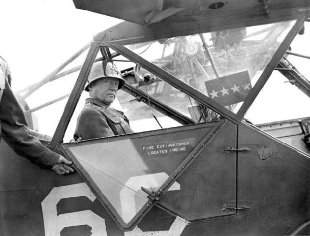 General Patton prepares to go aloft in a 14th Liaison Squadron L-5 Sentinel to review the US 103rd Infantry Division at Kirchdorf, Germany, on 14 September 1945. Note the 4 star placard and the text “FIRE EXTINGUISHER LOCATED INSIDE” painted on the door.