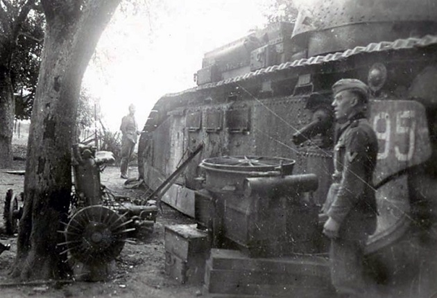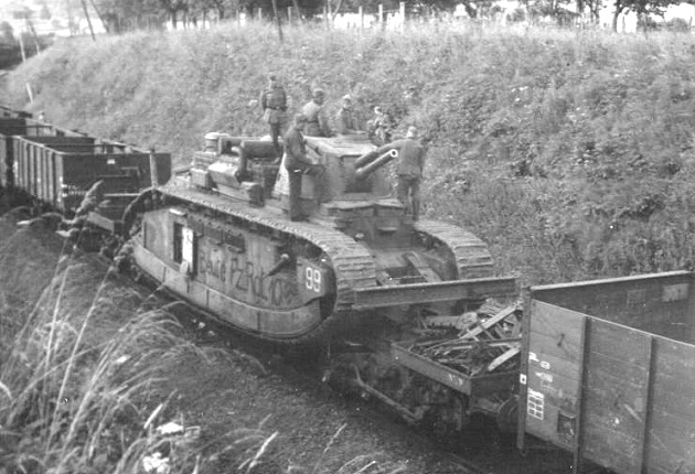 A cleaned up N° 99 Champagne is at an ordnance collection point. The “Erbeutet Pz.Rgt.10” legend that was painted on the hull side had been removed. In the foreground on the platform is a quick firing 25-pounder Mk I howitzer mounted on a 18-pounder Mk IV/V carriage or commonly called the “18/25-pounder”. In France 1940, 704 of them were lost. Behind it and next to N° 99 is a puny French 25mm anti-tank gun. The Germans wearing long coats indicate that this photo was taken in the fall of 1940.