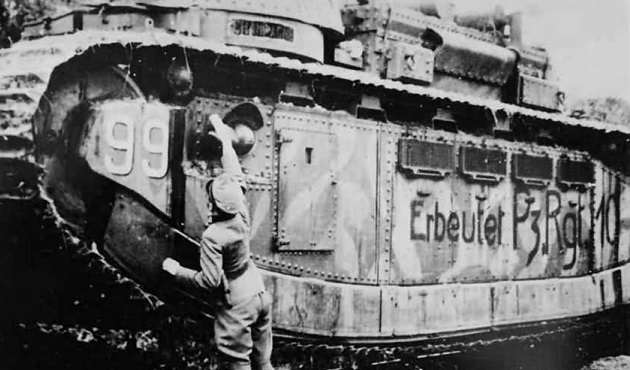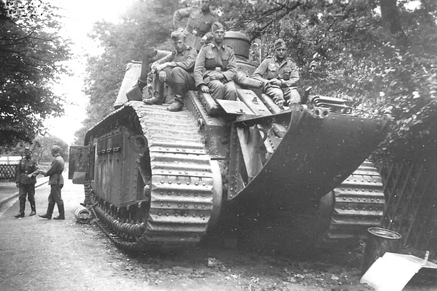Germans are examining N° 95 Touraine near Mainville. Note the hoist mounted on the rear of the main gun turret and the open hatch on the rear machine gun turret.