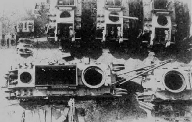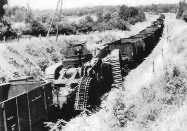 Germans are examining the right side of destroyed N° 98 Berry on the train. Note the riveted construction of the blown out hull plate.