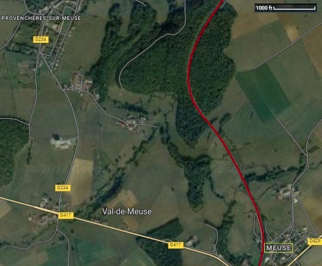 Today, Meuse is located southeast of Val-de-Meuse along route D417. The Meuse River zig-zags to the west of the rail line (in red) which flows northward to Neufchâteau and then to Verdun. The location of the blocked tank trains would most likely be on the curved section of track in the wooden area to the north of Meuse. In 1940, that area had shattered trees and brushes but 80+ years later that area could had grown into a small forest.