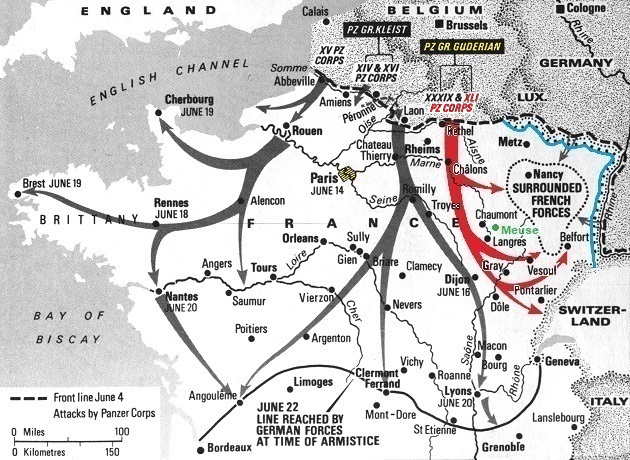 The abandoned Char 2Cs near Meuse were subsequently captured by the 10. Panzer-Regiment, 8. Panzer-Division, XLI Panzer-Korps. The XLI Panzer-Korp started near Rethel advancing south through Châlons passing west of Chaumont and Langres. The leading elements raced ahead to the Switzerland border entrapping French forces behind the stationary Maginot Line (in blue). Follow up units fanned out and covered the countryside along the main advance route. The date when the Germans discovered the Char 2Cs is not known but it most likely have been sometime in late June.