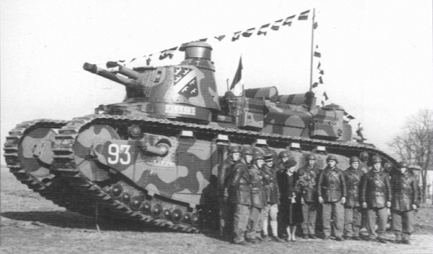 The crew and VIPs pose next to Char 2C N° 93 Alsace in 1939. Note the crest on the turret and the camouflage pattern on the hull.
