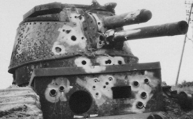 Due to its increased frontal armor (90mm), the Germans also tested their anti-tank guns on N° 97. Note the extra armor on the turret roof and the frame along the top of the front armor plate. The gun muzzle was not shattered.