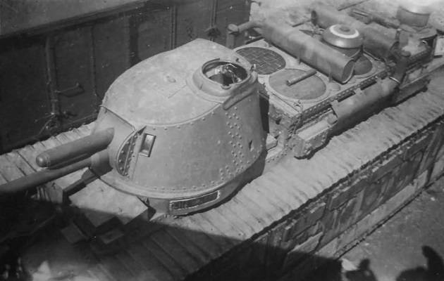 Secondary armament was four Hotchkiss Modèle 1914 8mm machine guns with one in the rear turret. There were three independent machine gun positions, one on each hull side and the third to the right of the driver on the front hull, all in ball mounts providing protection against enemy infantry. It carried a total ammunition load of 9504 rounds for all the machine guns.