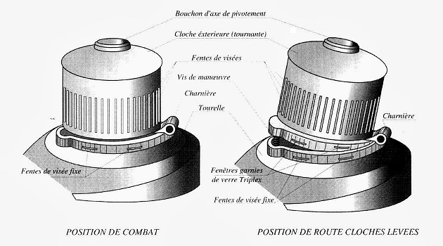 Another unique feature was the stroboscopic cupolas on top of the two turrets. The cupola consisted of armored outer and inner cylinders, both pierced by several regularly spaced vertical vision slits around the circumference. Rotating the external cylinder at 300 rpm with an electric motor created the visual illusion of seeing through the cupola as if it was not there due to human persistence of vision, similar to how a picket fence with spaced planks fades from view when the observer moves along side it at speed. The short time both the inner and outer slits were perfectly aligned at any given moment still afforded protection of the inside space, as any projectile not capable of piercing the armor directly would need hit the spaced out slits and to come at an optimum angle and timing to go through both the outer and inner slits. It provided a better view of the surroundings than a single vision slit or a periscope with a narrow field of view.