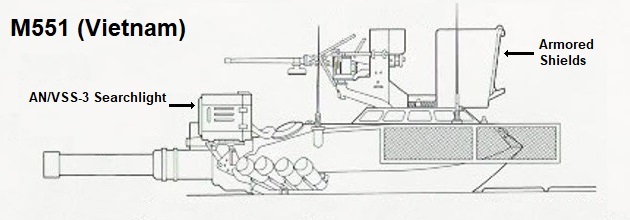 After being in country, the crews quickly modified their new mounts to increase their survivability in Vietnam. Gun shields used on the M113 Armored Cavalry Assault Vehicle (ACAV) were acquired and fitted to the tank commander’s .50 Cal machine gun and cupola. Many M551s mounted a AN/VSS-3 searchlight on the front of the turret to the left of the main gun. Since the M551 lacked internal space, many M551s had field fabricated extended bustle racks of various designs to hold extra ammo cans, rations and other equipment.