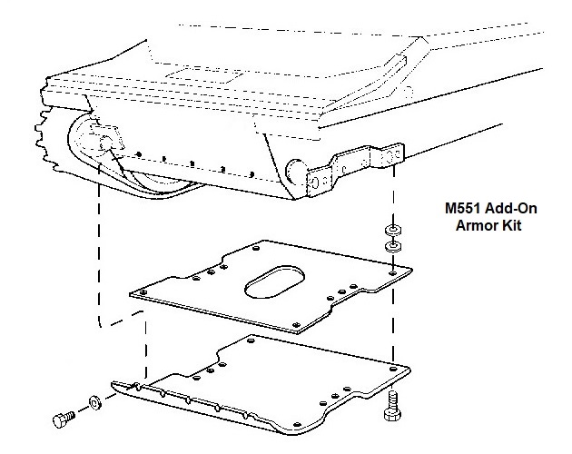 Often crewmen choose to ride on the outside of the M551 risking enemy fire to escape the heat and the threat of land mines. The driver was the unfortunate one who could not ride outside. To provide more protection from land mines, an Add-On Armor Kit was developed to add an extra layer of spaced steel armor bolted onto the bottom of the M551. It only covered the front half of the lower hull providing extra protection for the driver.