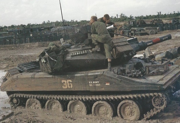 M551 A-36 sits in the mud at Landing Zone Hampton during a reconnaissance in force mission on 3 August 1969. Note the string of M18 smoke grenades hung on the side of the turret for quick use. The monsoon season in Vietnam generally began in mid-May and ends in late October/early November with the most rainfall in August and September. The lighter M551 was able to navigate through the mud better than the heavier M48A3 tank.