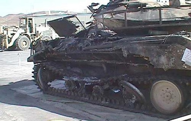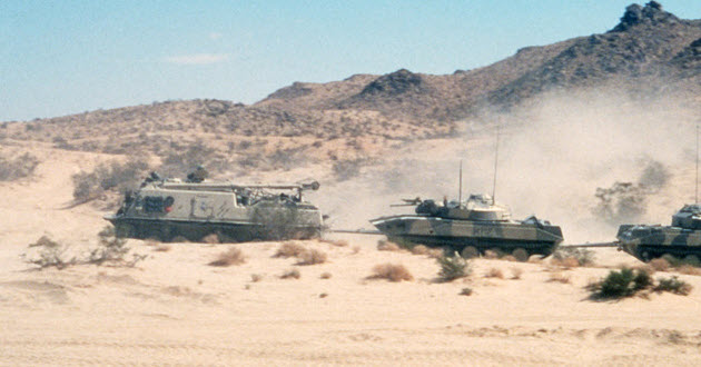 The Sheridan VISMODs were also prone to break downs at the NTC. A M88A1 Armored Recovery Vehicle tows two M551 VISMOD BMP-1s back for repairs.