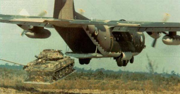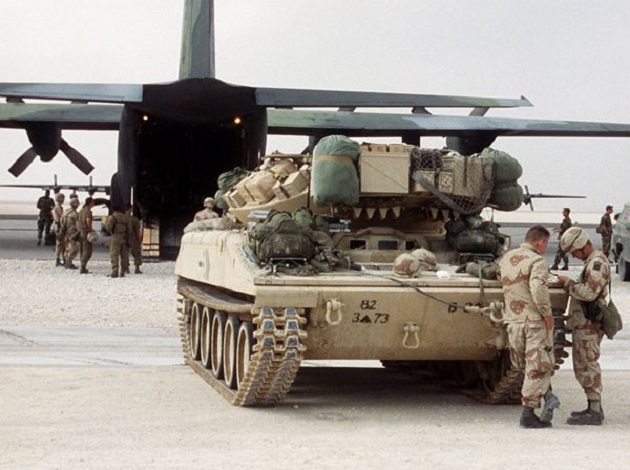 After the Desert Storm air war began on 17 January 1991, the modified M551A1s were re-positioned in theater by C-130H transports, where one is being loaded here.