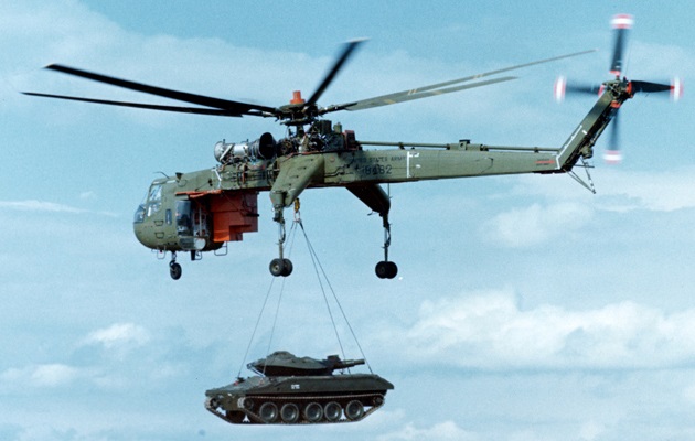 A Sikorsky CH-54B Tarhe heavy lift helicopter, more commonly known as the “Flying Crane”, carrying an M551 Sheridan at the Redstone Arsenal in Alabama.