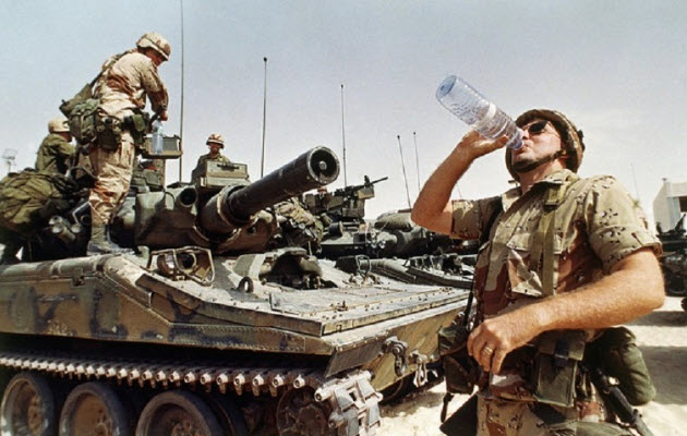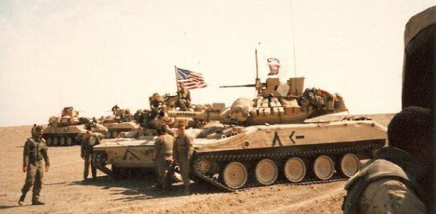 The first M551A1s to arrive in Saudi Arabia were flown in from their European bases on C-5 Galaxies still painted in their NATO green camouflage. Due the 120 degree heat in Saudi Arabia, all soldiers had to keep hydrated by consuming large quantities of water throughout the day.