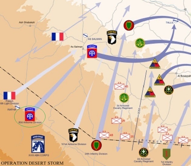 For the Desert Storm Operation, US 82nd Airborne Division was positioned in the area southeast of the Rafha Airport located along the northwest border of Saudi Arabia. On 24 February 1991, the 82nd Airborne supported by the Sheridans of the 3-73 Armor crossed the border into Iraq and made a dash towards the As Salman Airbase located in Southern Iraq approximately 294 km (183 miles) south of Baghdad.