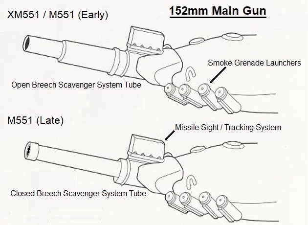 The XM551 pilots and the early production M551s main gun was designed with an Open Breech Scavenging System and bore evacuator. This system had the risk of blowing burning debris back into the vehicle and possibly igniting stowed rounds. This led to the redesigned Closed Breech Scavenging System (CBSS) that was factory installed beginning with production M551 number 700 and it was retrofitted to most of the earlier production M551s.