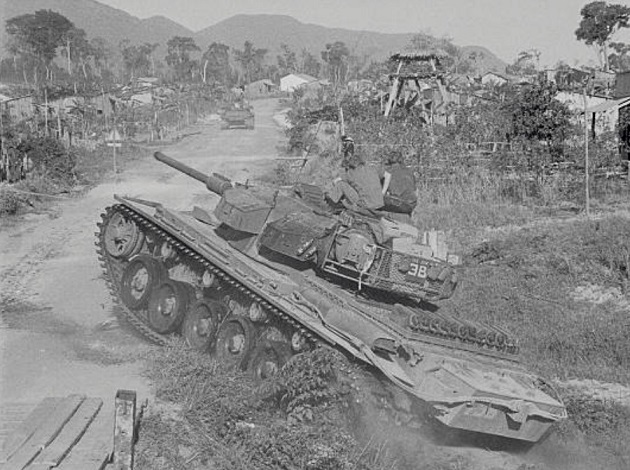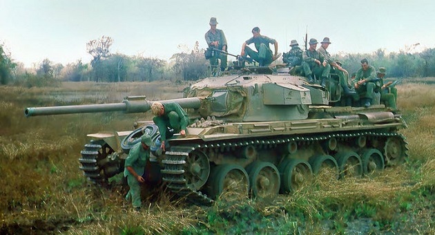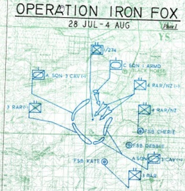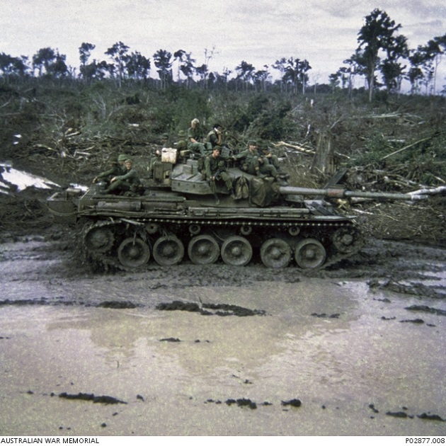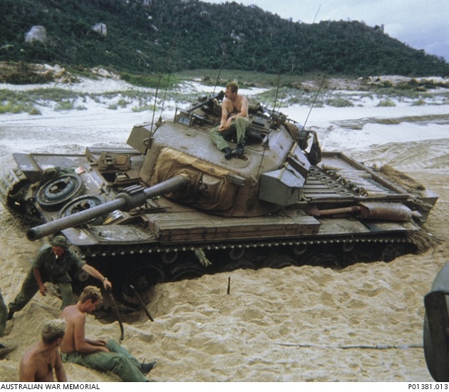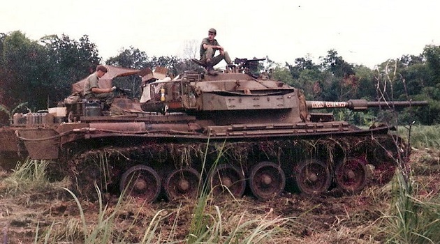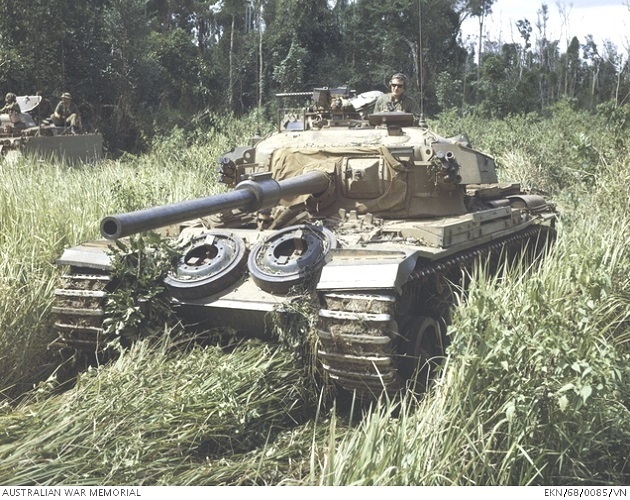 Operation Iron Fox was a typical “hammer-and-anvil” type of operation executed by the Australians in 1971. A blocking force of infantry and APCs would lay ambushes covering the likely VC/NVA escape routes from a selected area, while the tanks drove the enemy onto the guns of the waiting infantry. The 2nd Squadron SAS, 3rd Battalion, Royal Australian Regiment and the APCs of A Squadron of the 3rd Cavalry Regiment formed the blocking force, while the 4th Battalion, Royal Australian Regiment/Royal New Zealand Infantry Regiment (ANZAC) and the Centurions of C Squadron attacked the VC 274th Regiment along the Suoi Ca river. After an artillery and aerial bombardment of the enemy base area, the infantry companies advanced. C Company located a aggressively defended bunker system on the afternoon of July 29 and D Company supported by the Centurions, moved to assist C Company despite extremely heavy undergrowth and broken ground. D Company linked up with C Company forming into an attack formation by nightfall. Following their usual tactics in this situation, the VC withdrew during the night and the bunker system was subsequently destroyed the next morning after being searched by D Company.