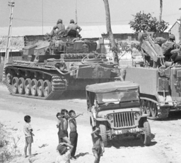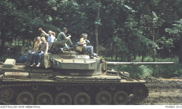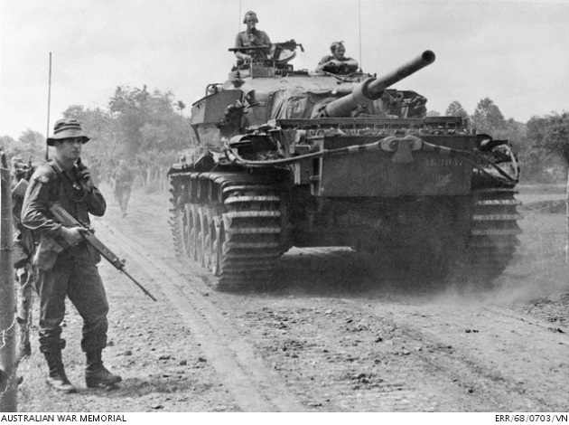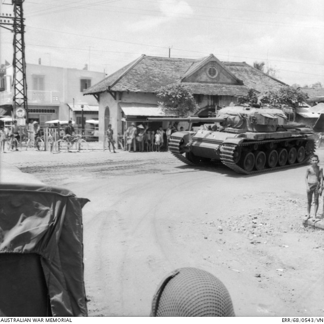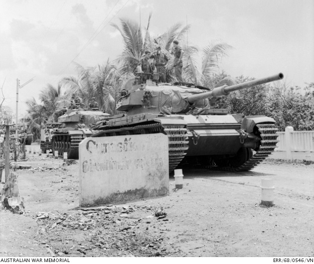 Centurions of C Squadron on a road patrol passes Vietnamese civilians, September 1968. Off the road to the left is a M577 Command Post Carrier (based on the M113 APC).