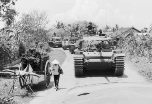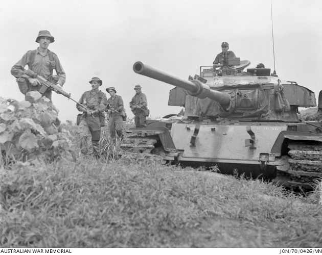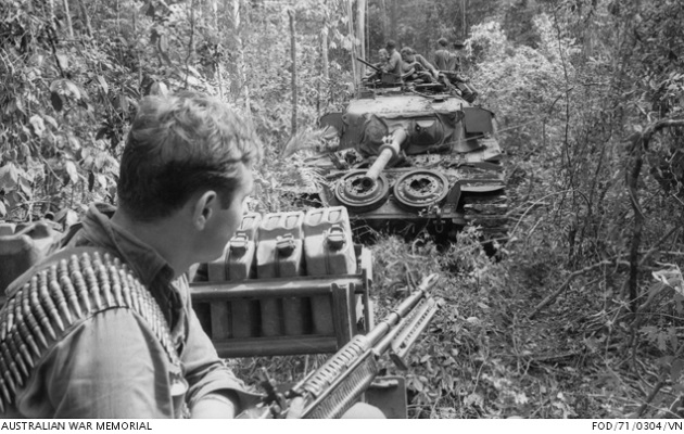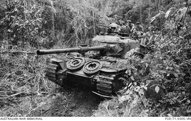 On April 18, troopers of 5th Battalion, The Royal Australian Regiment (5 RAR), advancing through thick jungle, supported by a Centurion of B Squadron search for the elusive Viet Cong during Operation Surfside.