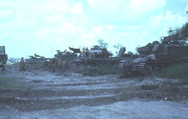 For tank crews, the dry season meant operating through a constant haze of dust that penetrated their clothing, permeated their pores and worked its way into their eyes and ears. The heat and humidity could become difficult to bear inside the tank that magnified the outside temperature. In the wet season, a different set of problems emerged, not the least of which was the need for vigilance against getting one’s tank bogged down in the mud. Rain and damp, however, caused the most obvious and most common problems. Men stayed wet for much of the time and being inside the tank made little difference even if the hatches were open.
