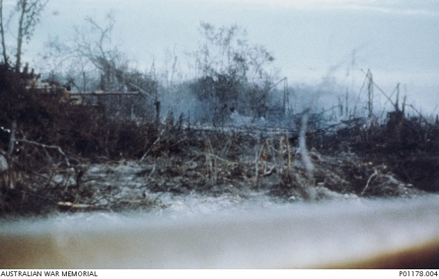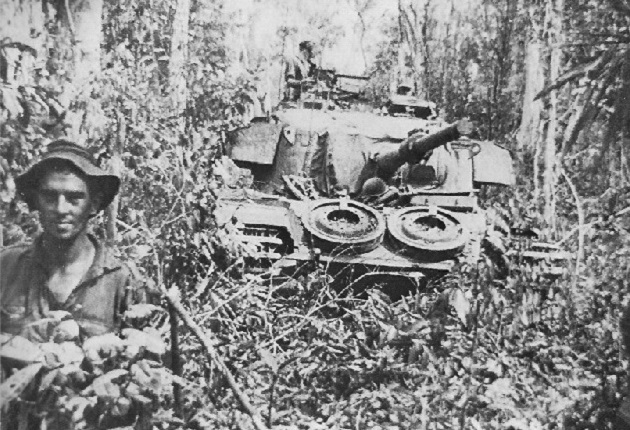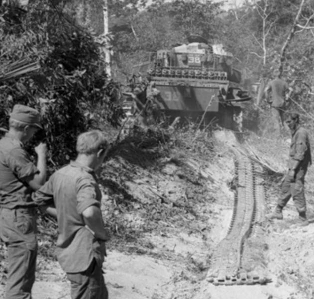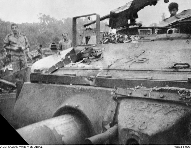 D Company spearheaded the advance down the creek line and again in the afternoon contacted a large occupied enemy bunker system. The Centurions were refueling at that time and they performed a minor miracle to scrub bash over “impossible armoured terrain” to rejoin D Company in the attack in less than one hour. A savage tank battle soon followed. The VC countered the tanks advance by firing RPG rockets into the tree branches immediately above the tans, knowing that the Centurion crews fought with open hatches for increased visibility and ventilation. The VC also learned that the Centurions would continue to fight despite repeated direct hits to the hull and turret. By firing into the jungle canopy above the Centurions, the enemy were able to incapacitate the crews with fragments from the rockets exploding above them.