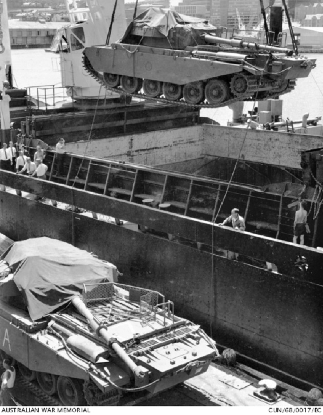 In February 1968 at Pyrmont Wharf, New South Wales, Australia, the first 15 Centurion tanks were loaded on the Australian National Line (ANL) bulk carrier MV Jeparit bound for Vietnam. The Jeparit was moved from her normal berth in Walsh Bay to Pyrmont to enable the Centurions to be loaded. At Pyrmont wharf, the huge floating Titan Crane of the Cockatoo Dock and Engineers Company Pty Ltd, went alongside the Jeparit and lifted each of the 52 ton Centurion from its rail car and lowered it into one of the Jeparit’s cargo holds. Note the external fuel tank on the rear hull of the tanks.