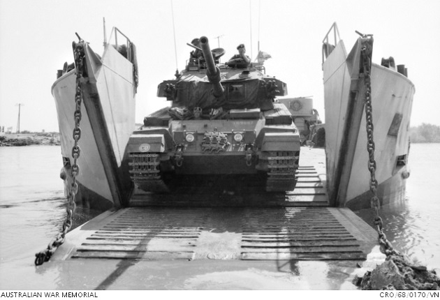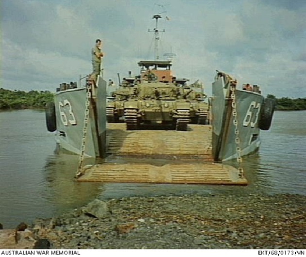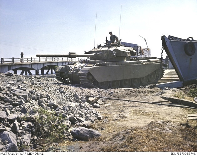 Centurion, ARN 169007, of C Squadron is unloaded off a LCU near Bà Rịa in March 1968. See below for more about Centurion 169007.